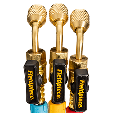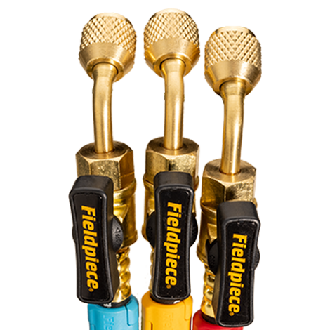 Fieldpiece Ball Valve hoses are built tough for demanding job sites, ensuring safety by preventing accidental refrigerant leaks and vacuum loss. Compatible with A2L refrigerants. Each hose measures 5 feet in length. This set includes three hoses.