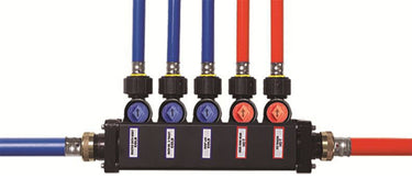 The Viega 49410 Dual Temperature Minibloc is a centralized water distribution manifold designed for multi-fixture plumbing installations. It features separate hot and cold water inlets with individual outlet ports, each equipped with a 1/4 turn shut-off valve for independent fixture control. Choose from standard or Zero Lead fitting options including PEX Press Polymer, PEX Crimp PolyAlloy, and PEX Compression connections. Distribution fittings are included; supply connections and fixture transition fittings are sold separately. Ideal for streamlined system management across residential and commercial applications.