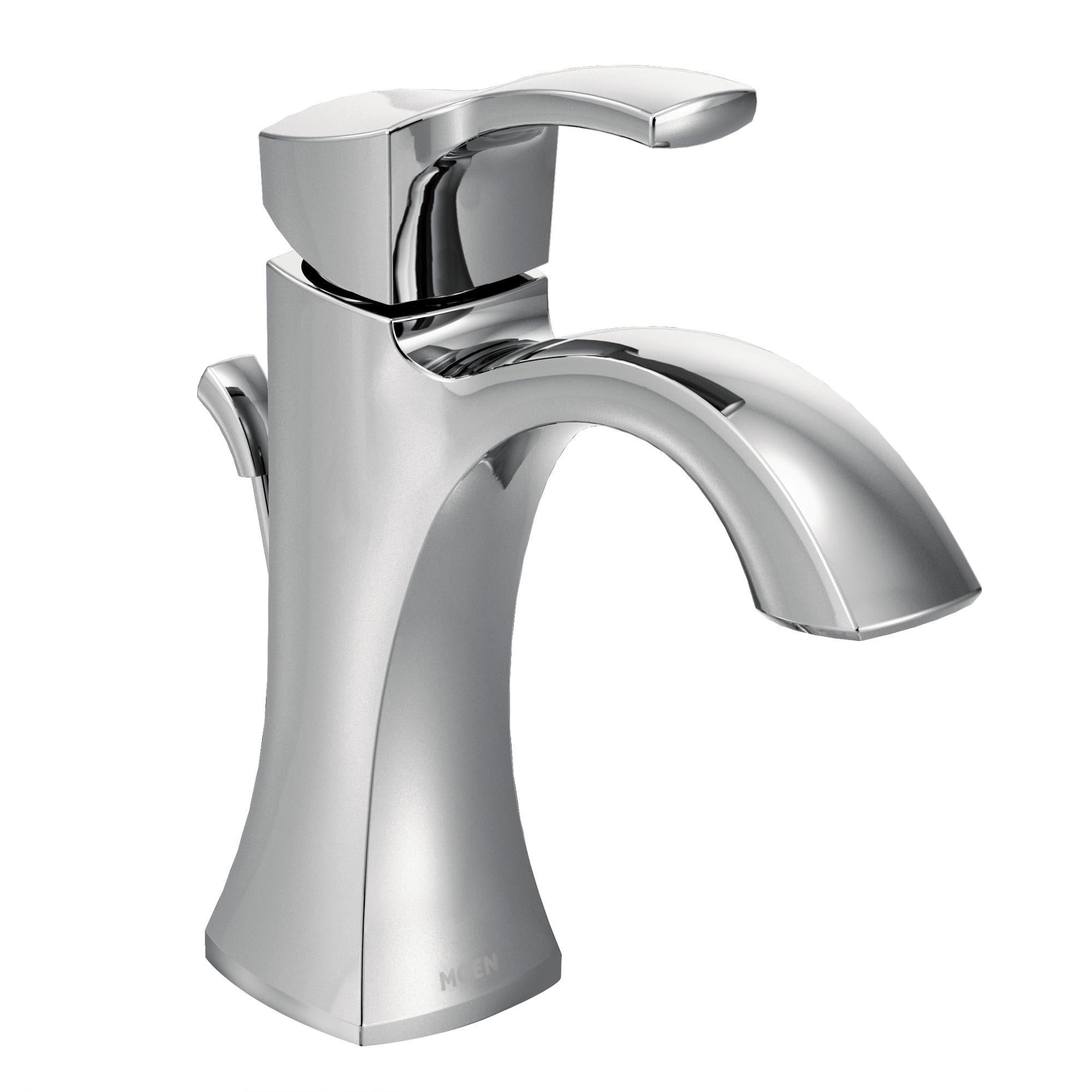 Moen® Centerset Bathroom Faucet, Series: 6903, Voss™, 1.5 gpm, Fixed Spout, 4.63 in Spout Reach, 4.68 in Spout Height, Lever, 1 Handles, Metal Pop-Up Drain, 1 Faucet Holes, 3/8 in, Compression, Spray Pattern: Aerated, 2-1/2 in Maximum Deck Thickness, Deck Mount, 1255 Duralast® Ceramic Disc Valve/Cartridge, 3 in W x 4.63 in D x 6.69 in H, Metal, Polished Chrome, Domestic