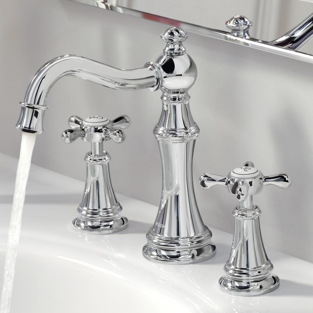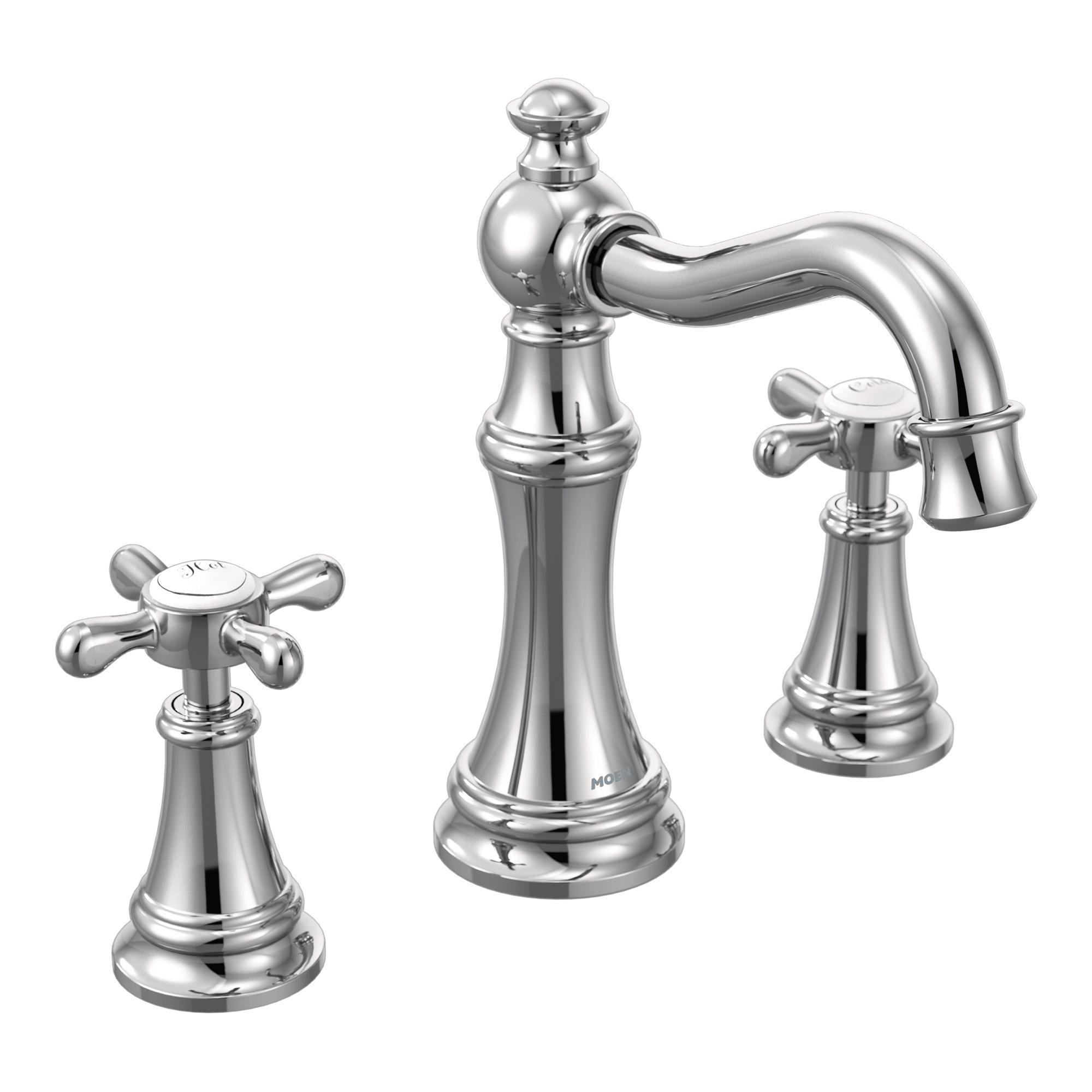 Moen® Widespread Bathroom Faucet, Series: TS42114, Weymouth™ Collection, 1.2 to 1.5 gpm Flow Rate, 8 to 16 in Center Distance, Fixed Spout, 5-3/4 in Spout Reach, 5-1/4 in Spout Height, Cross Handle, 2 Handles, Pop-Up Drain, 3 Faucet Holes, 1/2 in Connection, IPS Connection, 1-1/4 in Maximum Deck Thickness, Deck Mounting, 1224 Ceramic Disc Cartridge, 9.25 in W x 13.63 in D x 7.5 in H Dimensions, Metal, Polished Chrome, Domestic